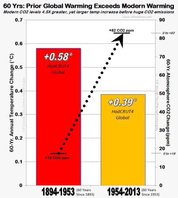 If what this graph is appearing to indicate is true – then the increase in temperature in the past 60 years has declined while the CO2 concentration has increased. This is counter to everything we have been told by the Green brigade.
